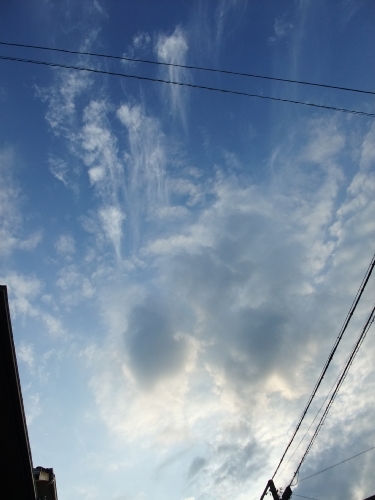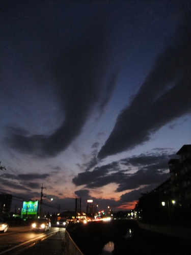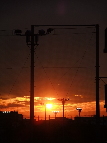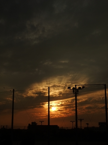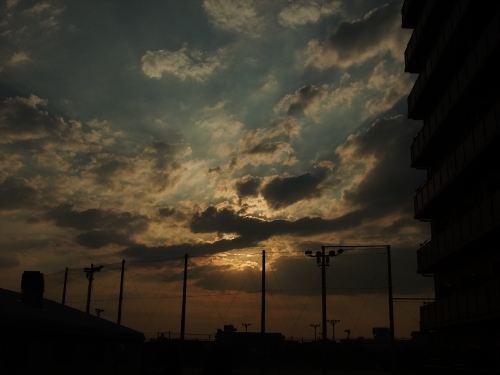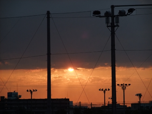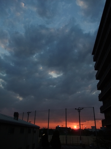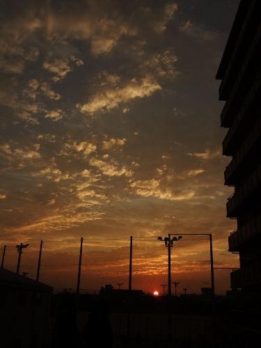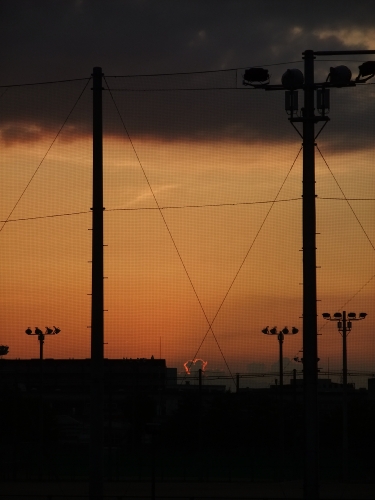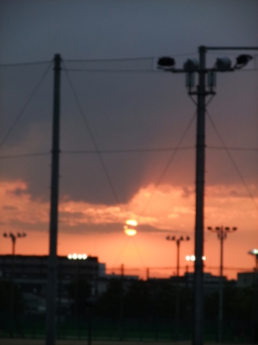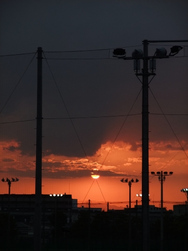 ほんとは全く同じ色じゃあないんだ。 それに、気持ちが感じてるようには撮れない。 そのへんが、ね、残念なんだけど。 ただの、部屋の窓からの風景なのに、ダイナミックに感じるんだよね。 あのね、夕焼け色に染まってる空は、全体じゃあないんだよね。 これは手前のグラウンドにフォーカスがいってないから、変なんだけど 太陽のカタチがおかしいでしょ? だるま夕日って聞いたことある? 海に沈む夕日が、屈折して変なカタチに見える現象なの。これはだるま、てカタチじゃあないけど、丸くないんだよね。 タイミング逃したから、あまりはっきりしないけど この写真でも、ゆがみは確認できるよね。なんとか。ギリギリさ。 この、夕焼け色に染まる空の上の黒い部分は夜、じゃあないんだ。こうなってんの。 ね。ちょっとおもしろいでしょう? 積乱雲みたいなのが集まって厚くなって でも、太陽の近くには、ないんだ。 そして、天気が悪いわけでも、ないんだ。 それから 今日の夕焼けだ。 ぼくは、この夕焼けを見るために、平日もこの時間にゆうごはんをできるだけとるようにしてる。 この日も仕事に行ってないけども、夕食の時間だった。一応。部屋が染まってくから、それでね、四六時中まぶしすぎる窓を見つめていなくても、あ、そろそろカメラ持とうかな、て思うんだ。 夕日が沈むのはほんとうにあっという間。 ほんとうに短いの。 おやすみ よい、夢を。 /ナオ | カレンダー
