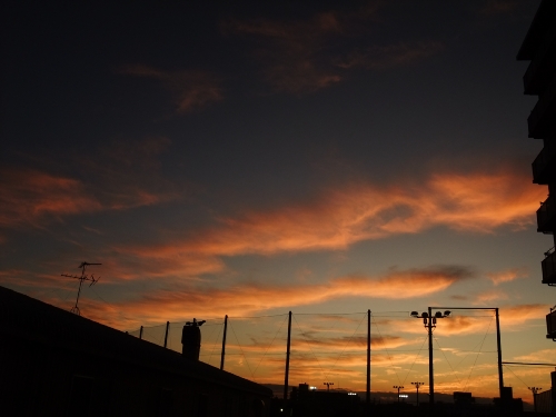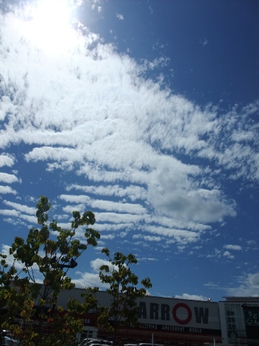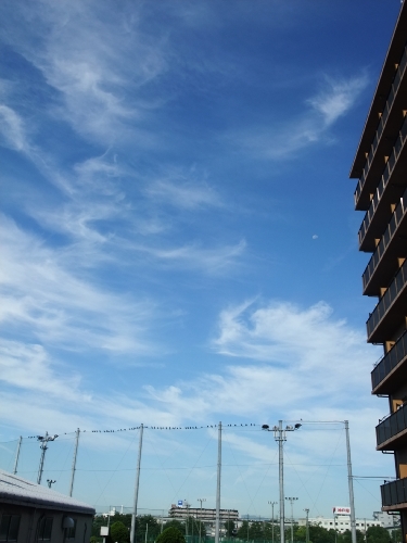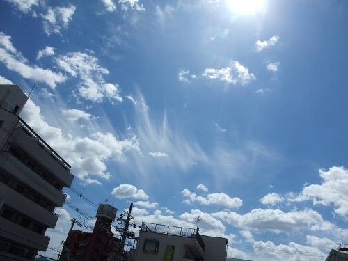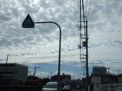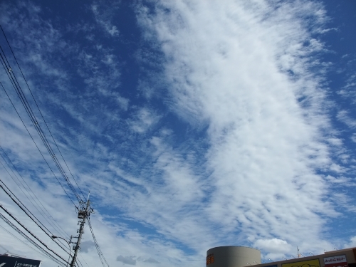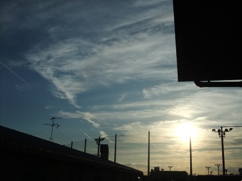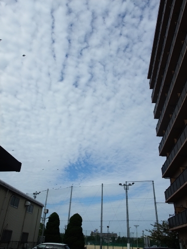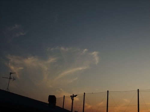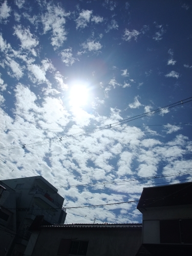 実はおしごと上、写真に納めておきたいものがあってカメラ持参したんだけど なんか、朝行きがけに思いの外空がきれいで、おっ!とかってたくさん撮ったんだ。 日中の写真て久しぶりな気がして。 朝、駐輪場で。 つまり、ぼくの部屋はこの位置の真上てことだよね。 ちょっと目線が違うでしょ。いつもの夕焼け写真に比べて。 グラウンドのネットのてっぺんめがけて鳩の集団が集まってきてるところだね。いつもずら~~~て並んでんの。 それで、行きがけの途中だけど、ウチを出てすぐ、空を見たらちょっと変わってて 思わず撮ったんだ。 集まりすぎたひつじぐもが基本なんだけど、下の方。横の段々になってる雲のあいだが 斜め下に向かってサーって流れてる感じがおもしろかったの。 他にもこんなんとか。 こんなんとか。(パチンコ屋通過中。) こんなんとか。(ホームセンター通過中。) こんなんとか。 あれ?またウチだ。これはいつ撮ったんだろう? ほら、鳩が並んでるでしょ。 よくわかんないよね。 昼ご飯で戻った、っけ? 次の夕方のは、昨日じゃない。もうちょっと前。いつだったかなー こっち、じわりじわりとインフルエンザ流行りだしてる。 スーパーとか病院には、手の殺菌スプレーを置いたりしだした。 このままずっとこの冬までは流行続けるんだと思う。 ぼくもいつかは掛かるんだろう。みんな掛かると思うよ。 いまのうちに、掛かったらどうすりゃいいのか調べておかなきゃいけないね。 気をつけて。 おやすみ /ナオ